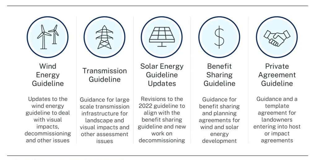 The new wind and solar energy guidelines will have supporting technical guidelines for noise or visual impact assessment, decommissioning calculators, and visual impact assessment tools. The benefit sharing guideline includes a brief "model and total value for benefit sharing, and the private agreement guideline includes a draft template agreement between an energy project proponent and a "host" or an adjoining landowner.