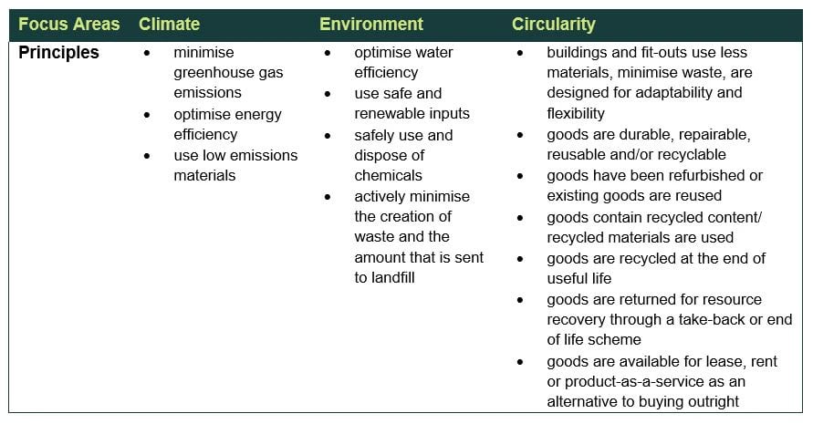 For construction services procurements, procuring officials will determine whether to set a Sustainability Rating for the project that the potential supplier will be required to achieve. The metrics are set out in the ESP Policy Reporting Framework.